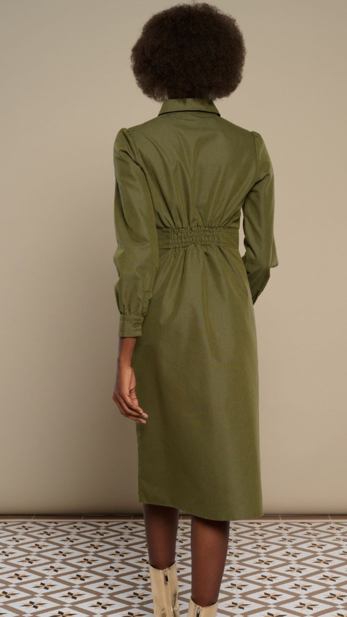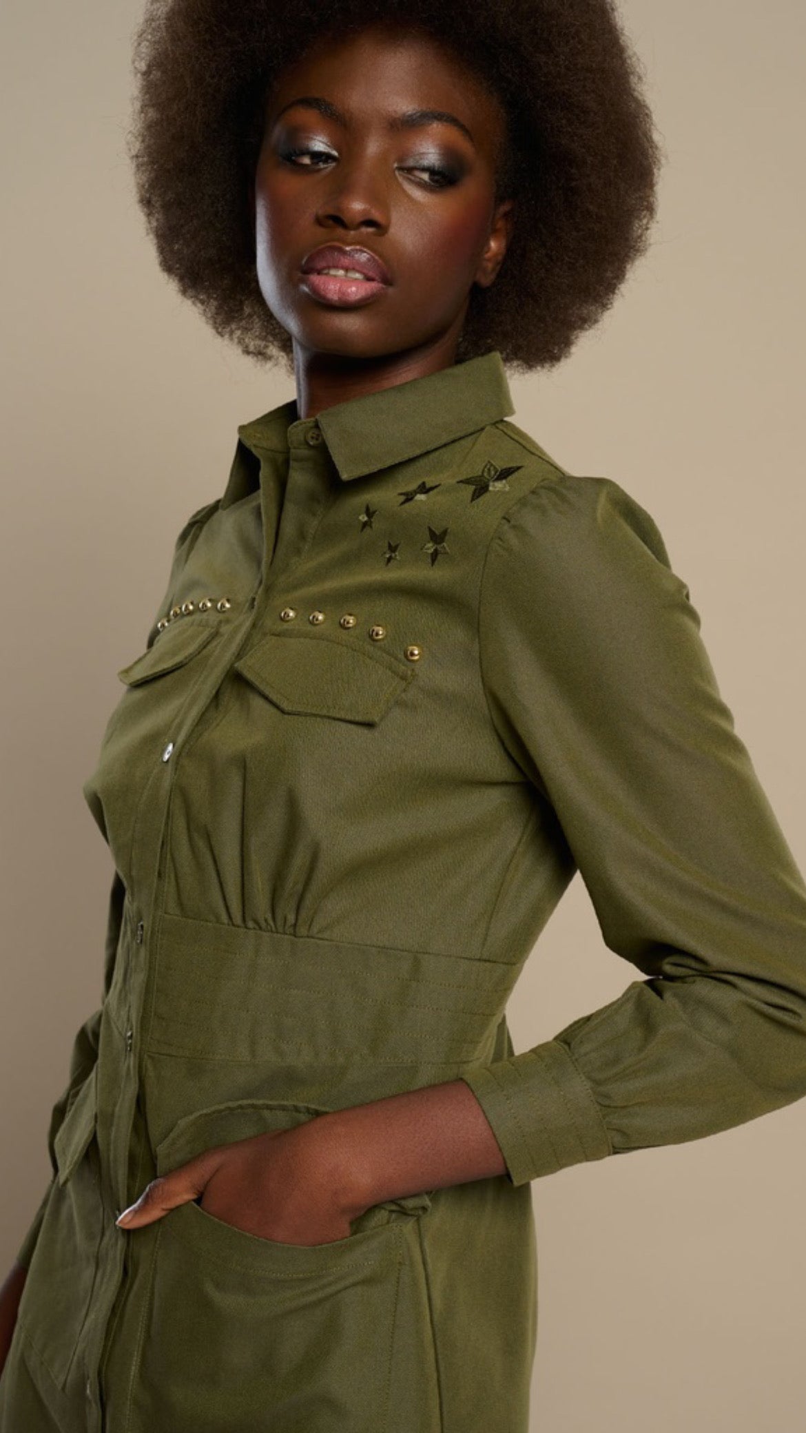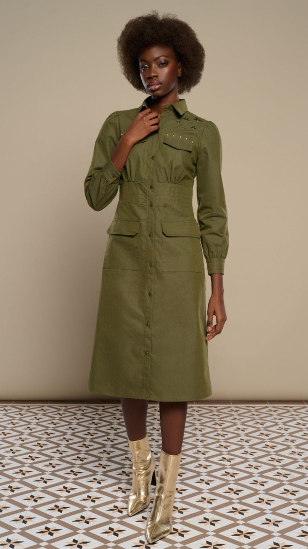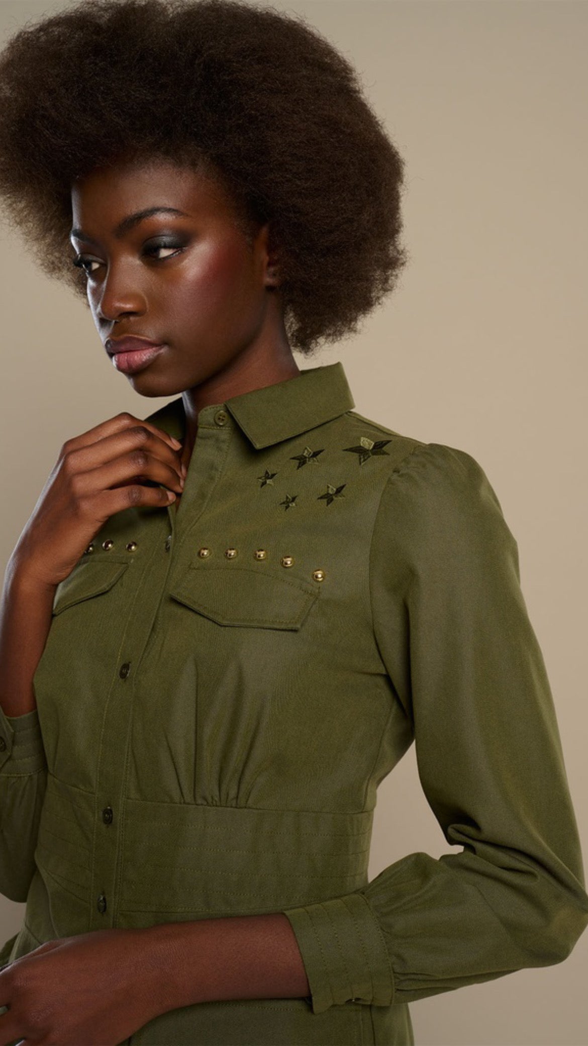 Este vestido camisero de inspiración utilitaria en color verde oliva es la pieza perfecta para quienes buscan un look versátil con personalidad. Confeccionado en un resistente tejido de mezcla 66% algodón y 34% poliéster, ofrece estructura y comodidad a partes iguales. Su cierre frontal abotonado, los bolsillos con solapa, la cintura entallada con frunces y los detalles de tachuelas doradas y estrellas bordadas en el pecho aportan un toque militar chic que marca la diferencia. El largo midi y las mangas ligeramente abullonadas equilibran el estilo robusto con un aire femenino.