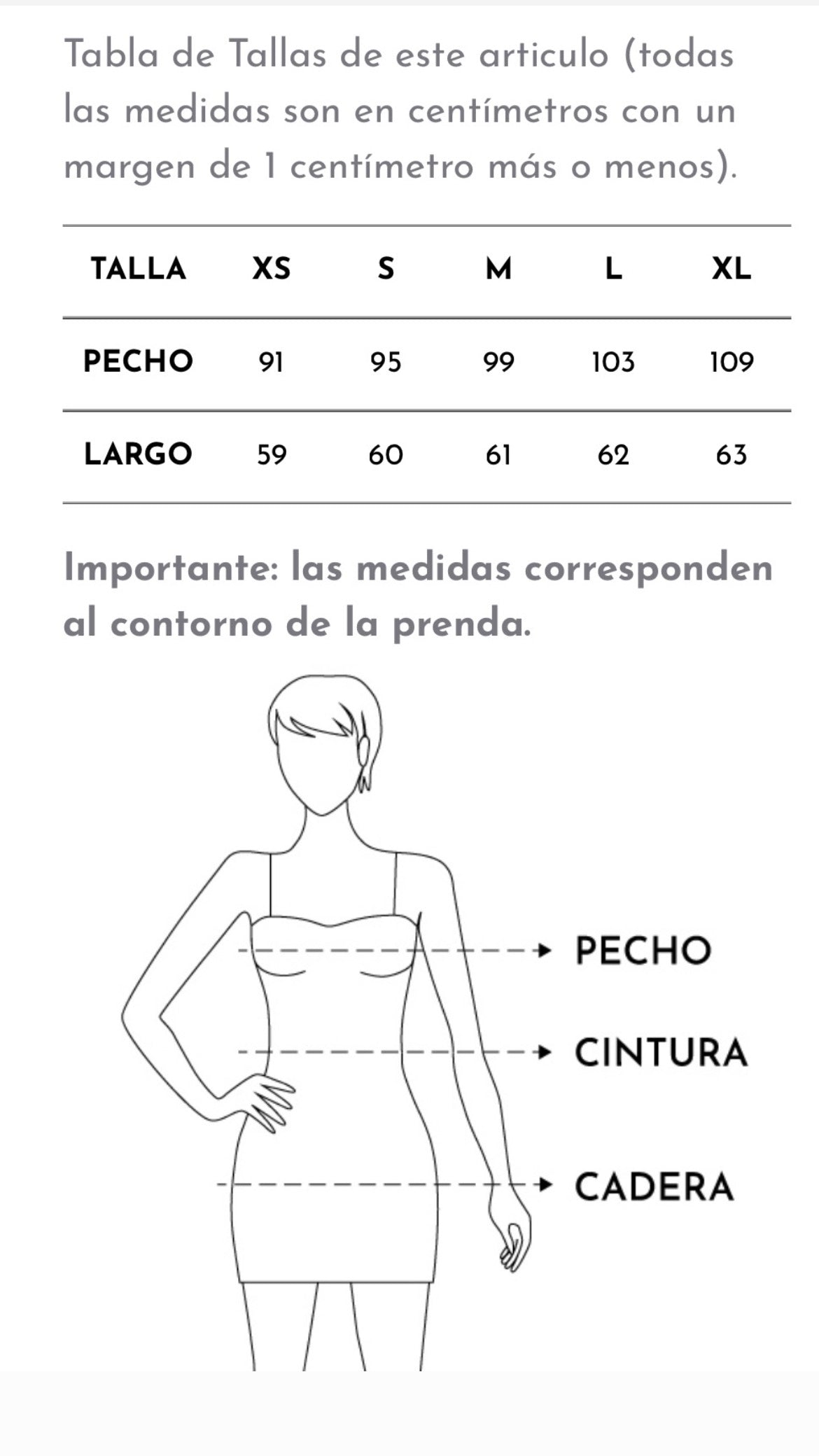 Tabla de Tallas de este articulo (todas las medidas son en centímetros con un margen de 1 centímetro más o menos).