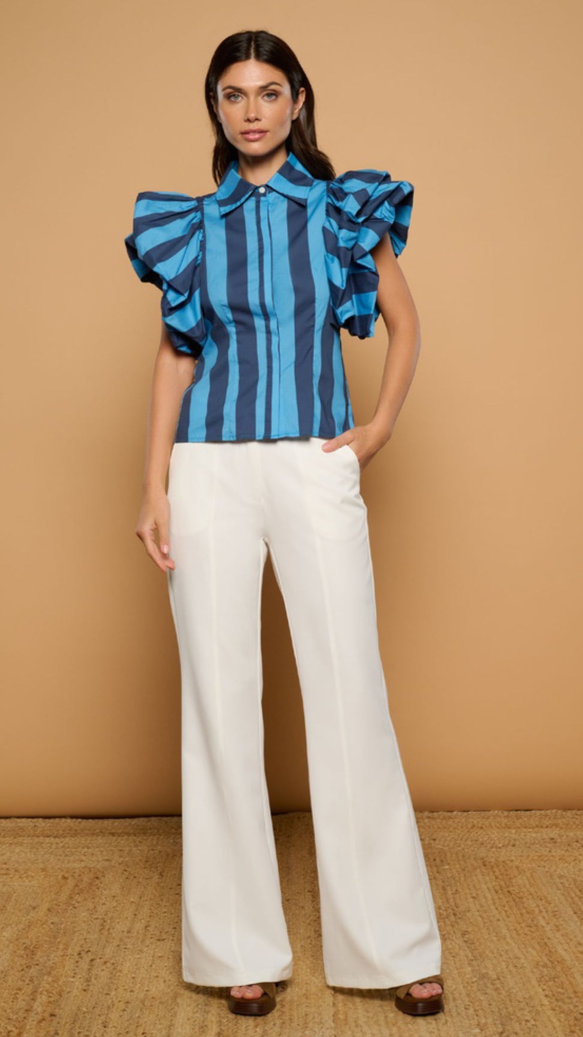 Blusa de rayas verticales en tonos azul marino y azul turquesa, con cuello camisero y espectaculares mangas cortas abullonadas con volantes. Diseño estructurado que estiliza la silueta y aporta un toque sofisticado y femenino. Cierre frontal con botón y tejido ligero de tacto agradable. Ideal para looks de invitada, oficina o eventos especiales.