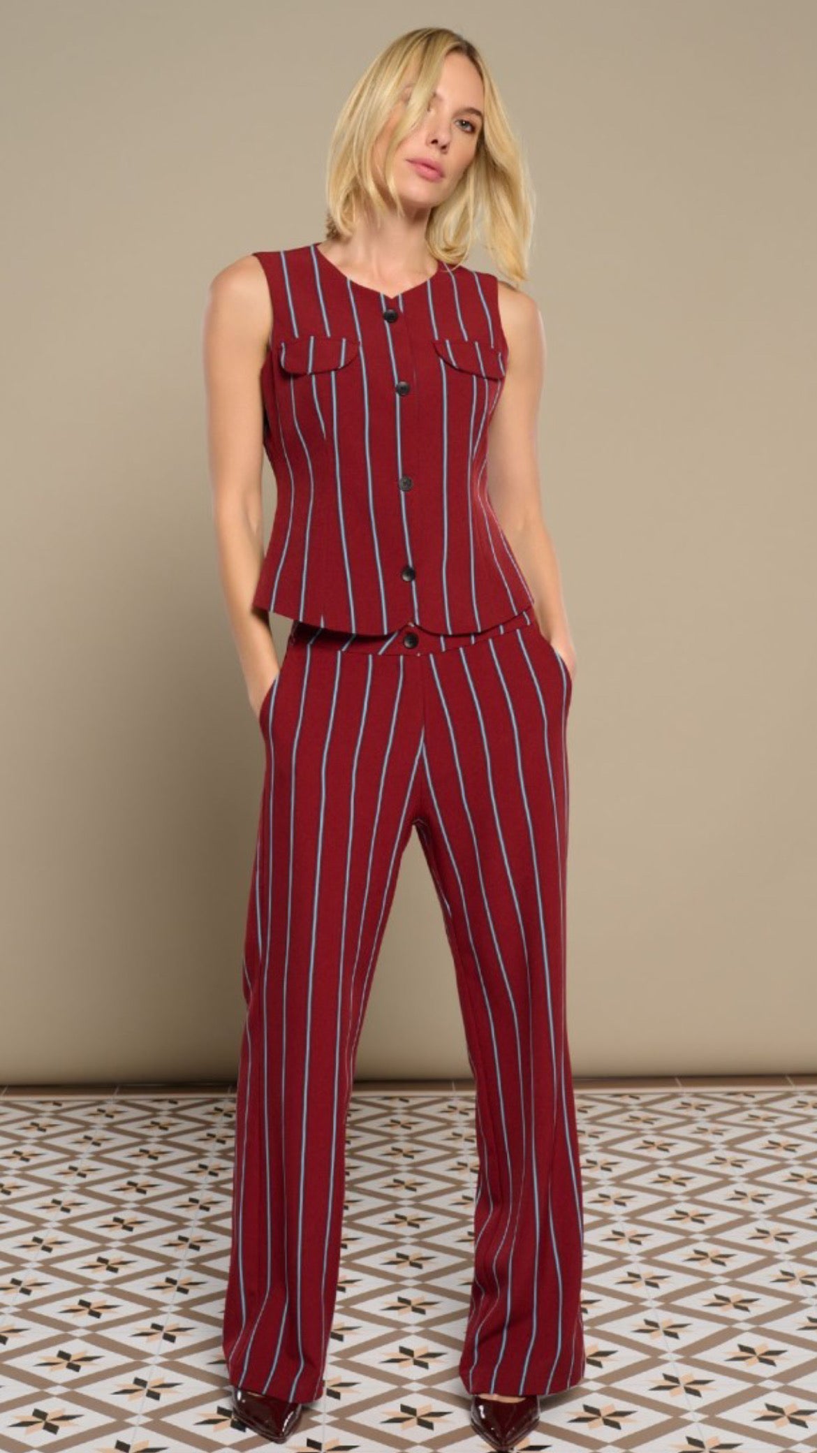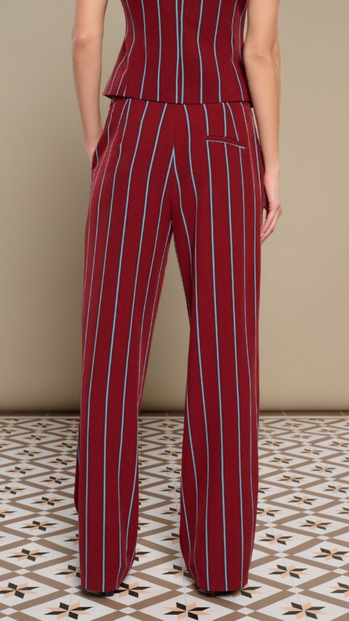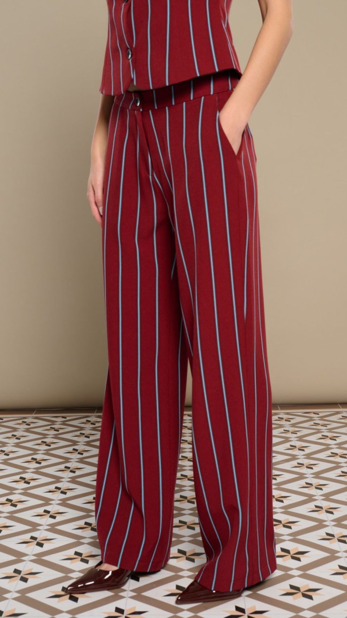 Pantalón palazzo de raya diplomática en azul sobre burdeos, un diseño sofisticado y elegante que nunca pasa de moda. Su corte amplio y fluido estiliza la figura, mientras que el cierre con cremallera y botón frontal asegura un ajuste cómodo. Con bolsillos laterales prácticos, es perfecto tanto para looks de oficina como para outfits más relajados pero con estilo.