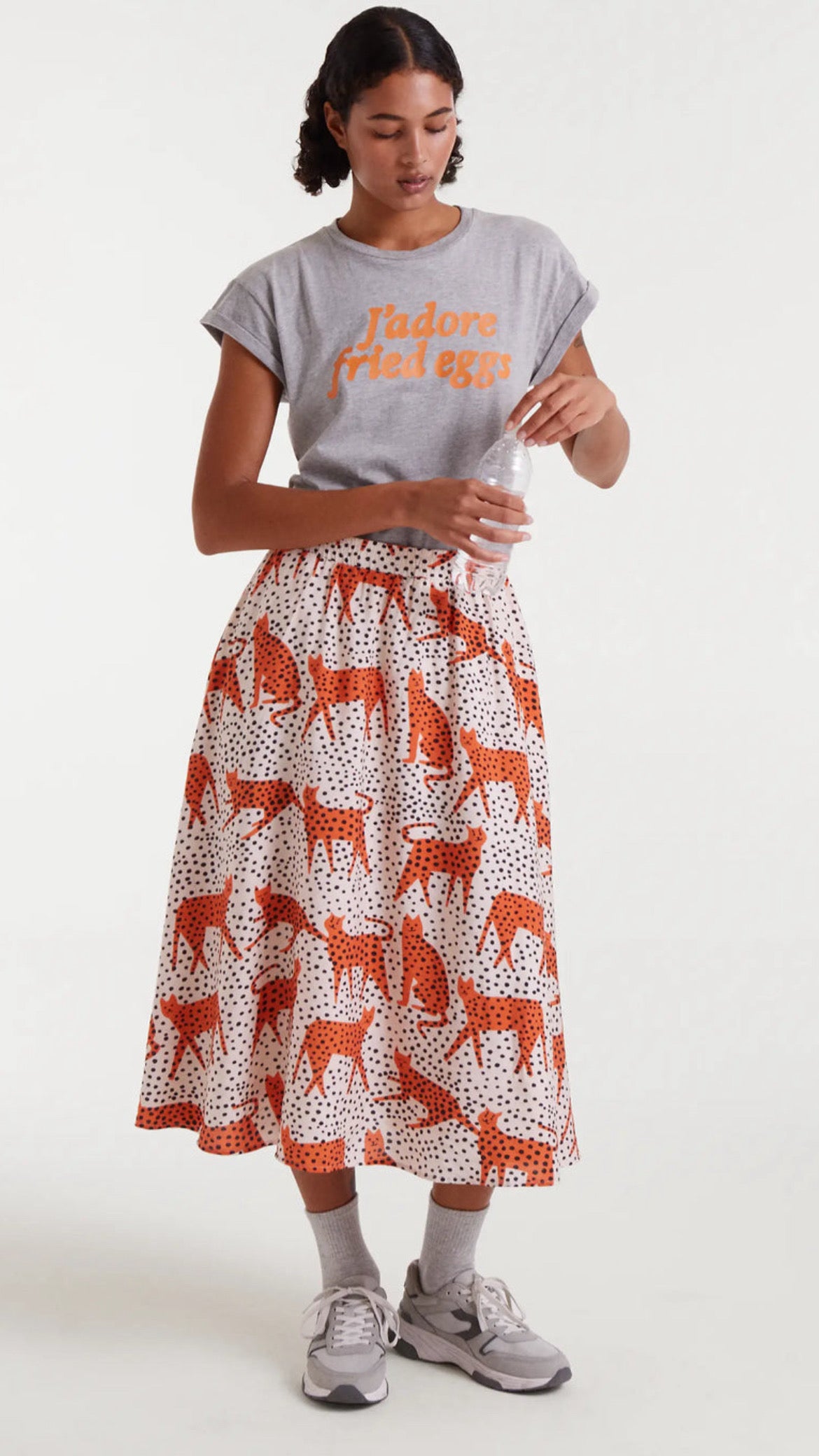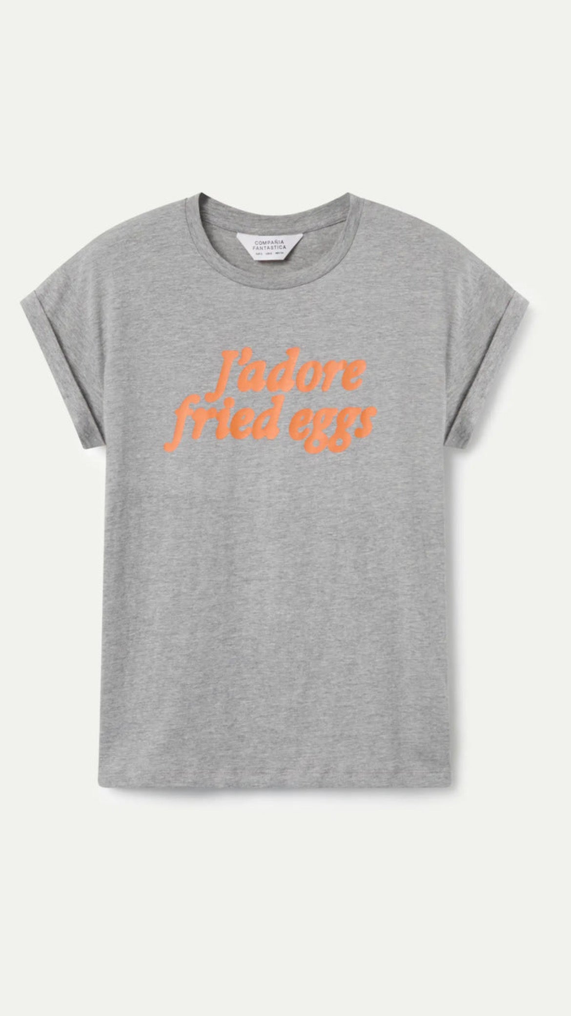Camiseta de manga corta confeccionada en 100% algodón, con cuello redondo clásico y diseño en gris vigoré. Destaca por su print frontal con el mensaje “J’adore fried eggs” en tono naranja que aporta un toque fresco y atrevido a cualquier look casual.