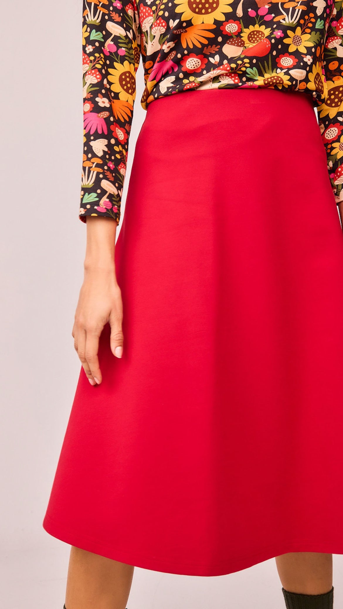 Falda roja de tiro alto con corte evasé y cintura elástica. Un básico versátil y atemporal que combina con todo: desde camisas estampadas hasta jerséis de punto. Su diseño favorecedor y cómodo la convierte en la prenda imprescindible para cualquier armario.