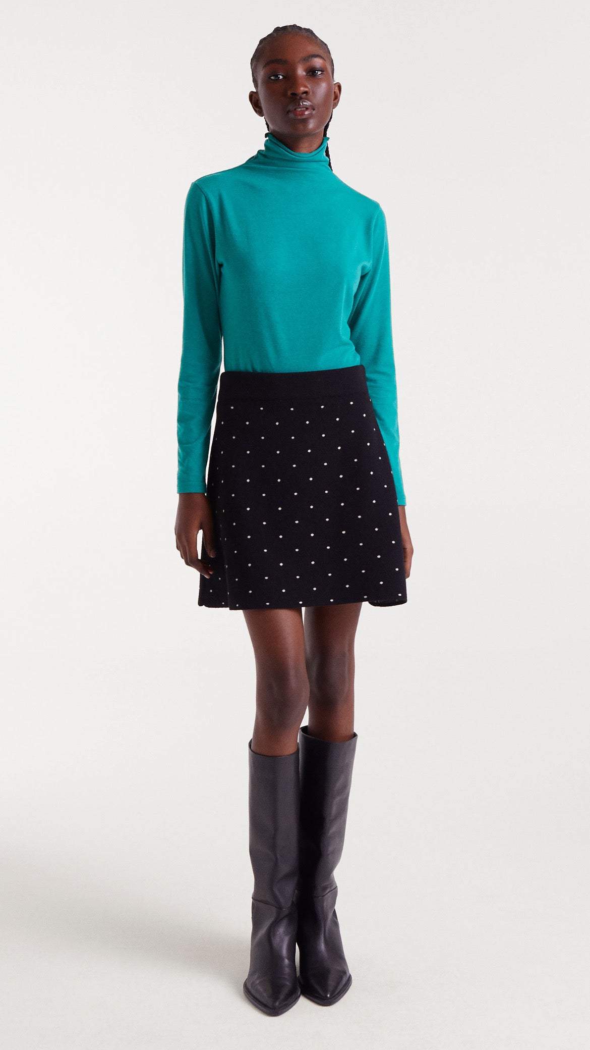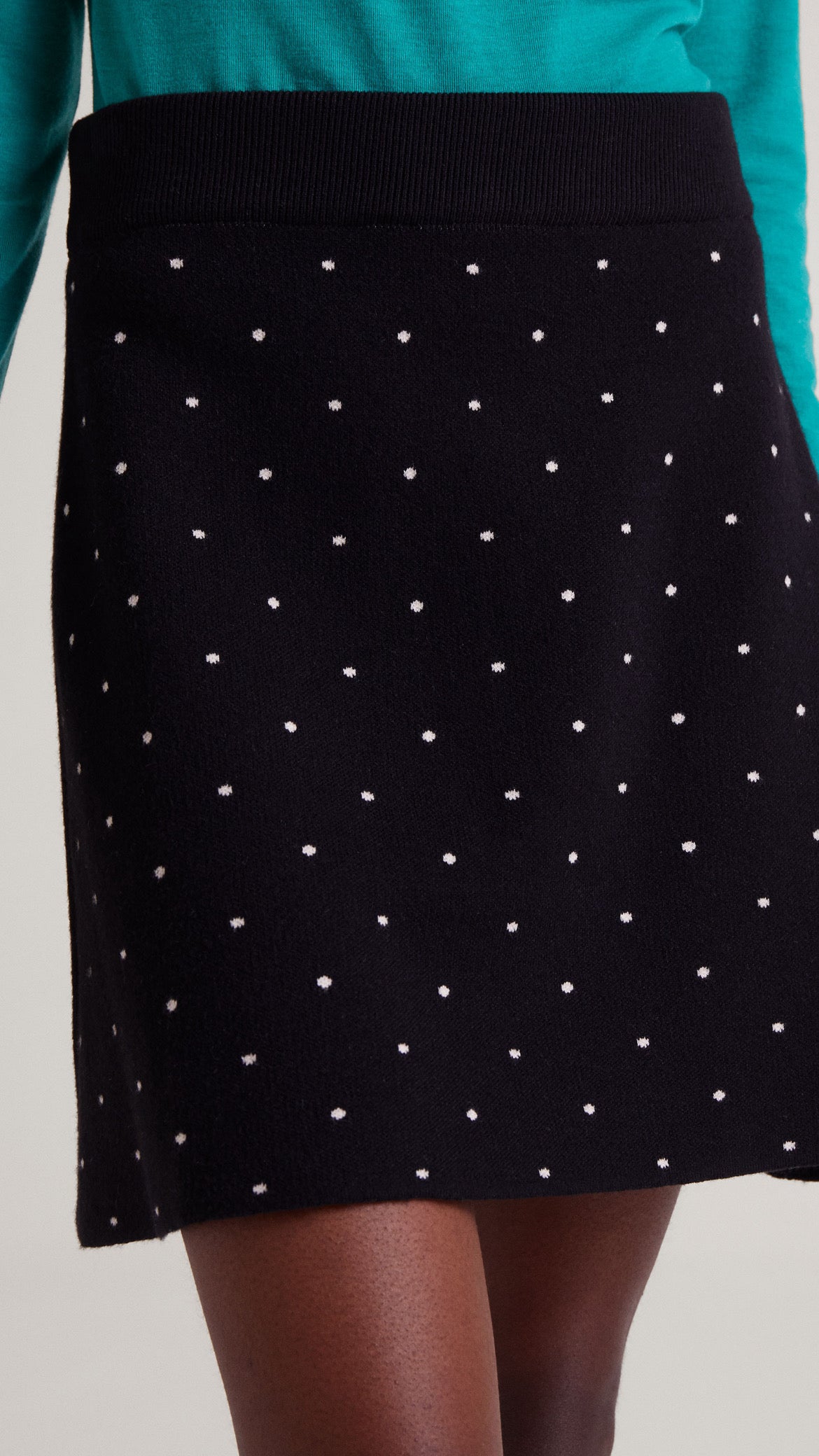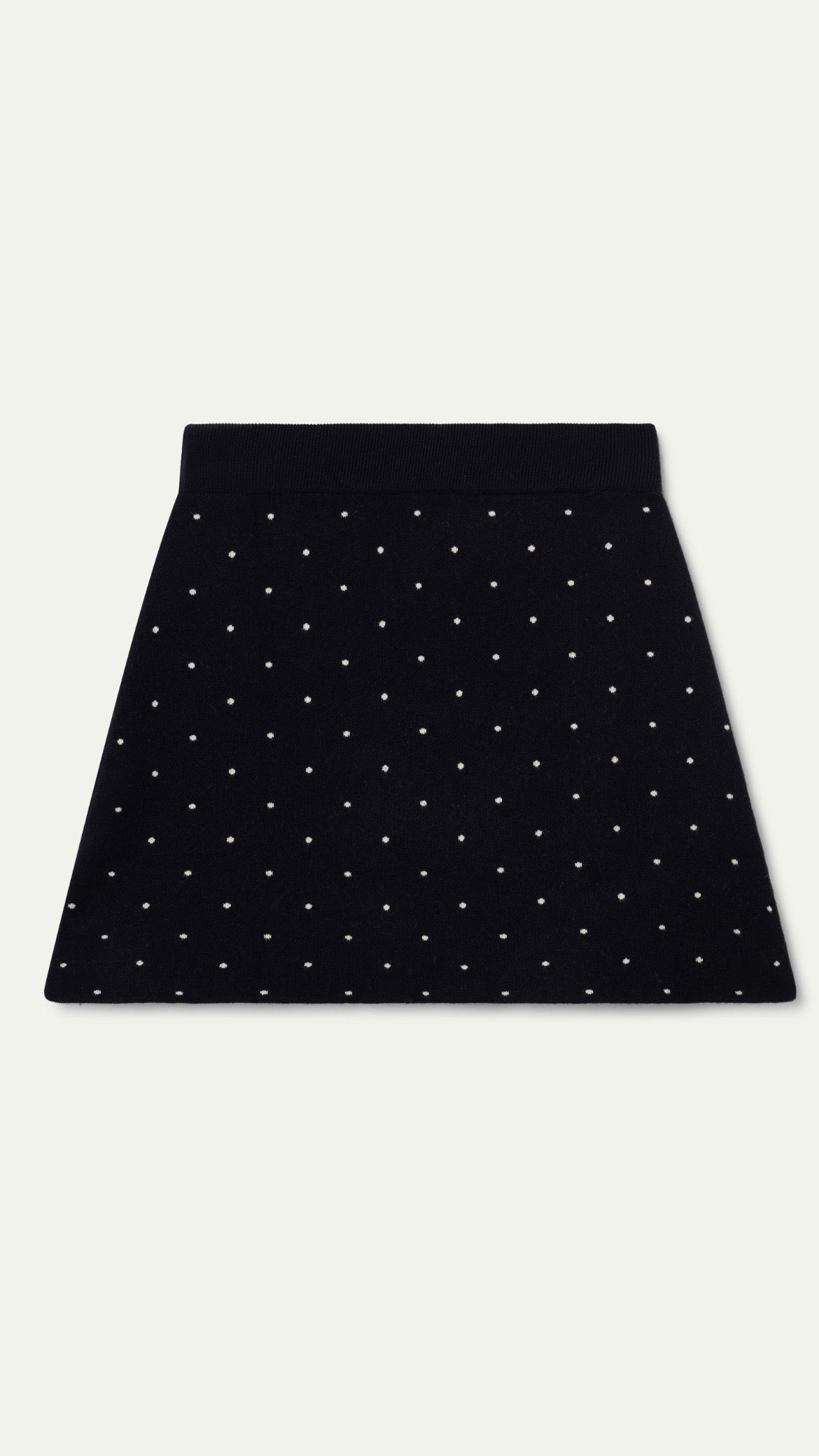 Añade un toque chic y versátil a tu armario con esta falda corta negra de corte recto y estampado de pequeños lunares blancos. Su diseño minimalista con cintura elástica garantiza comodidad y estilo, ideal tanto para looks casuales como más sofisticados.