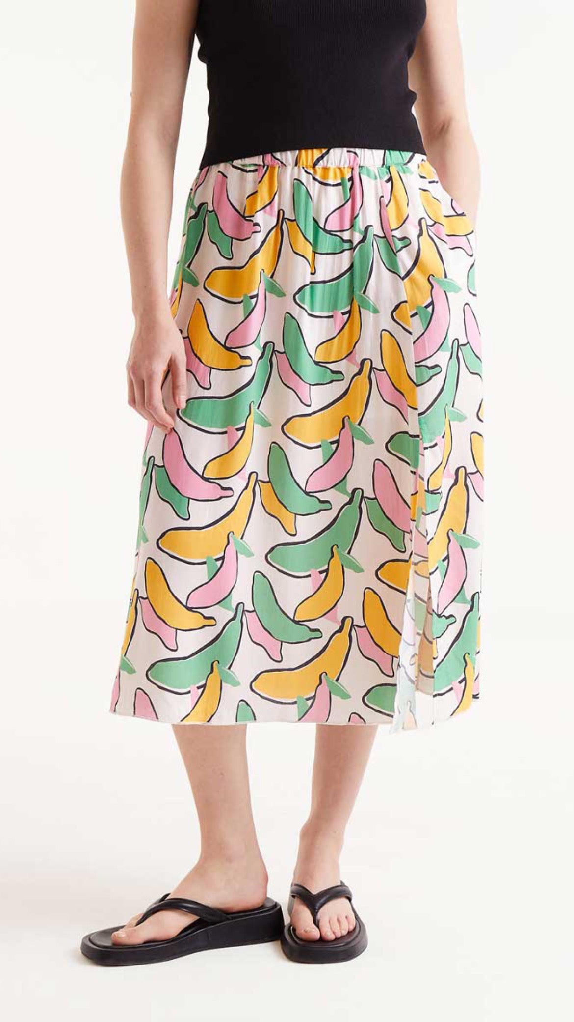 Esta falda midi es perfecta para añadir un toque de frescura y color a tu armario. Su cintura elástica de tiro medio garantiza un ajuste cómodo y favorecedor, mientras que el estampado Banana le da un aire divertido y desenfadado. Además, cuenta con bolsillos laterales, porque la practicidad también es clave.