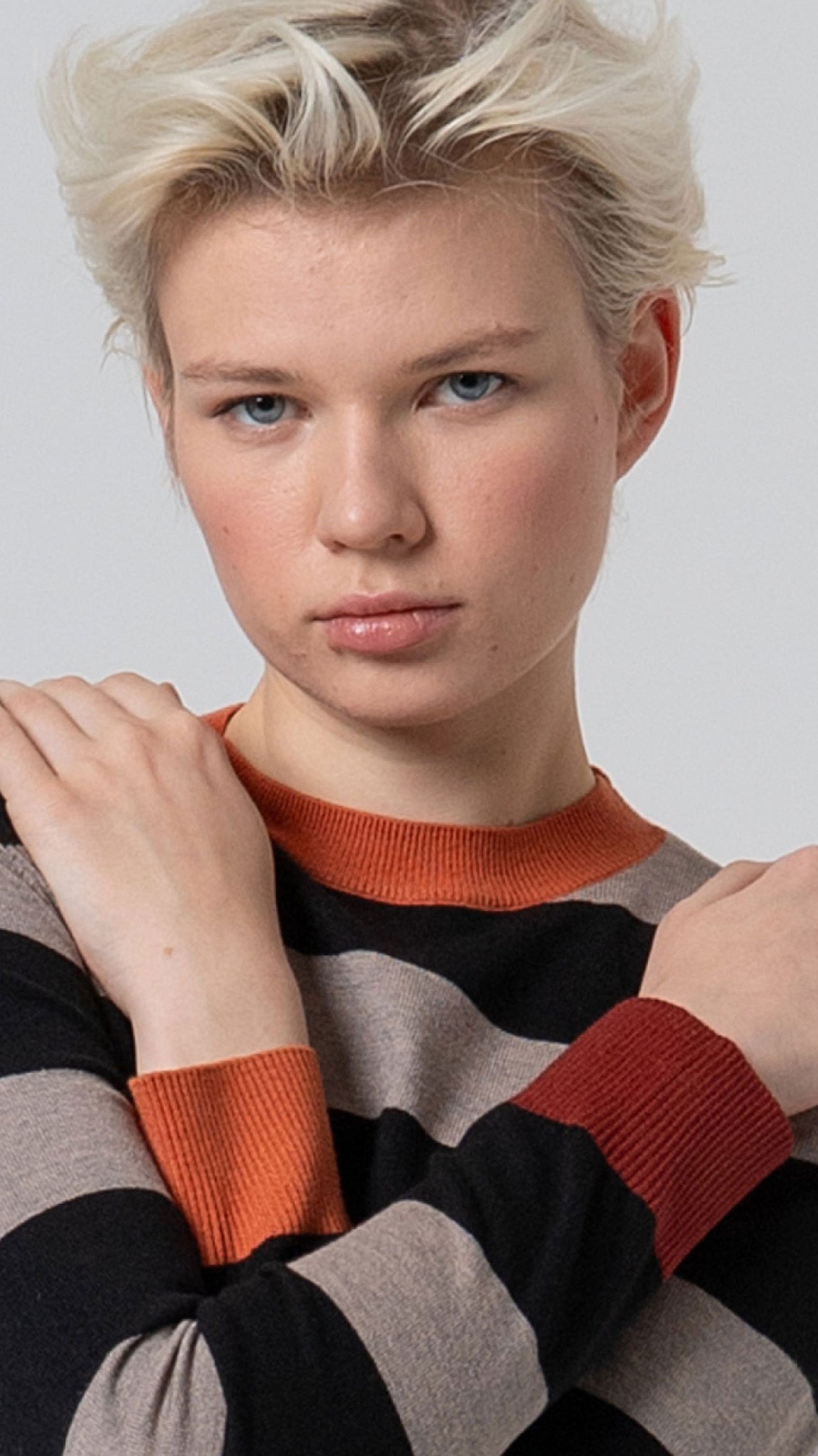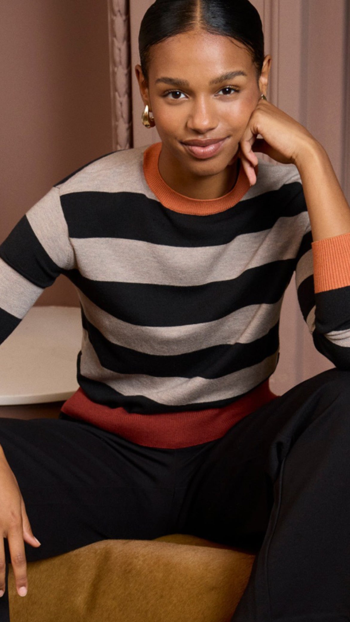 Este jersey de punto con cuello redondo y rayas anchas combina comodidad, calidad y un diseño divertido que nunca pasa desapercibido. Sus tonos neutros y cálidos lo convierten en una prenda versátil y actual, perfecta para tus looks del día a día.
