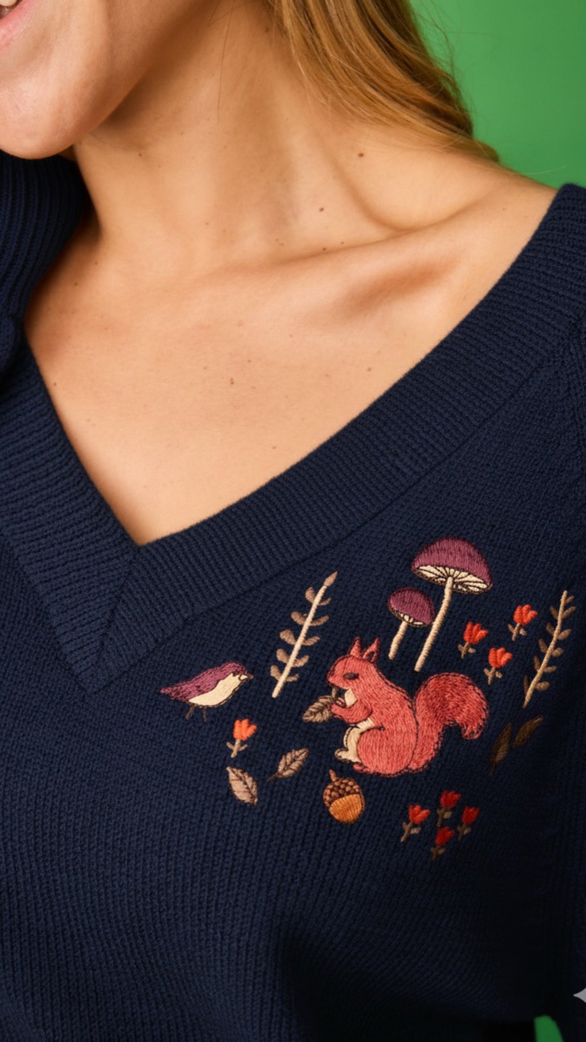 Este jersey azul marino con escote en pico es una auténtica joya. Su diseño destaca por un bordado exquisito de ardillas y hojas que aporta un toque natural y encantador. Confeccionado en punto suave y cálido, es perfecto para los días otoñales manteniendo siempre un aire elegante y original. Ideal para combinar con vaqueros o faldas, creando looks relajados con un guiño sofisticado.