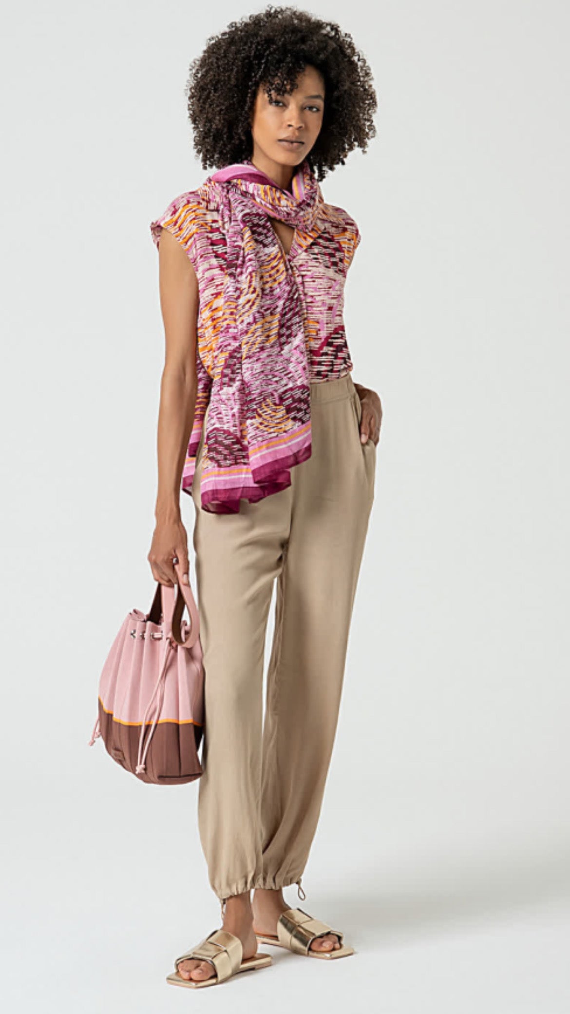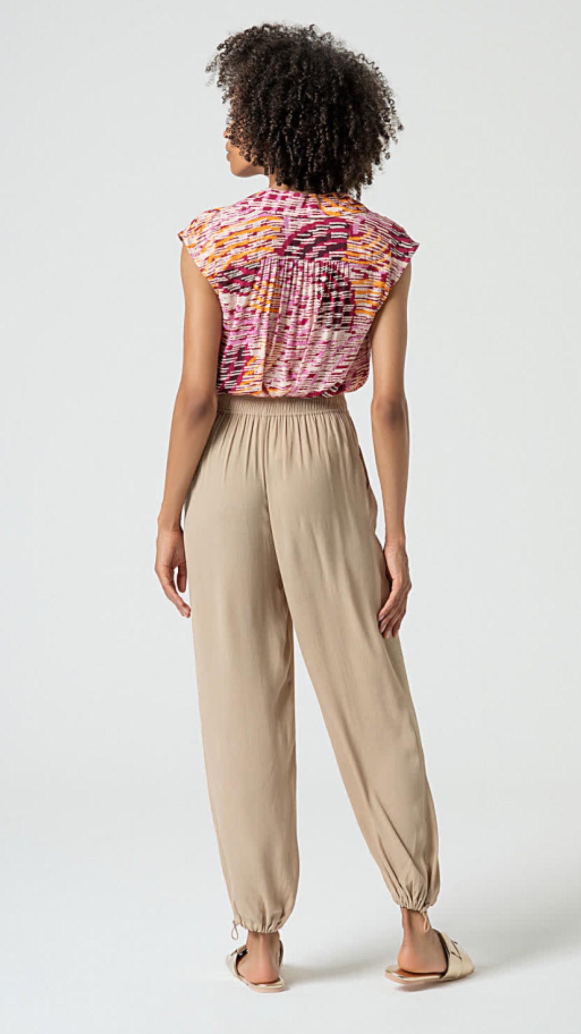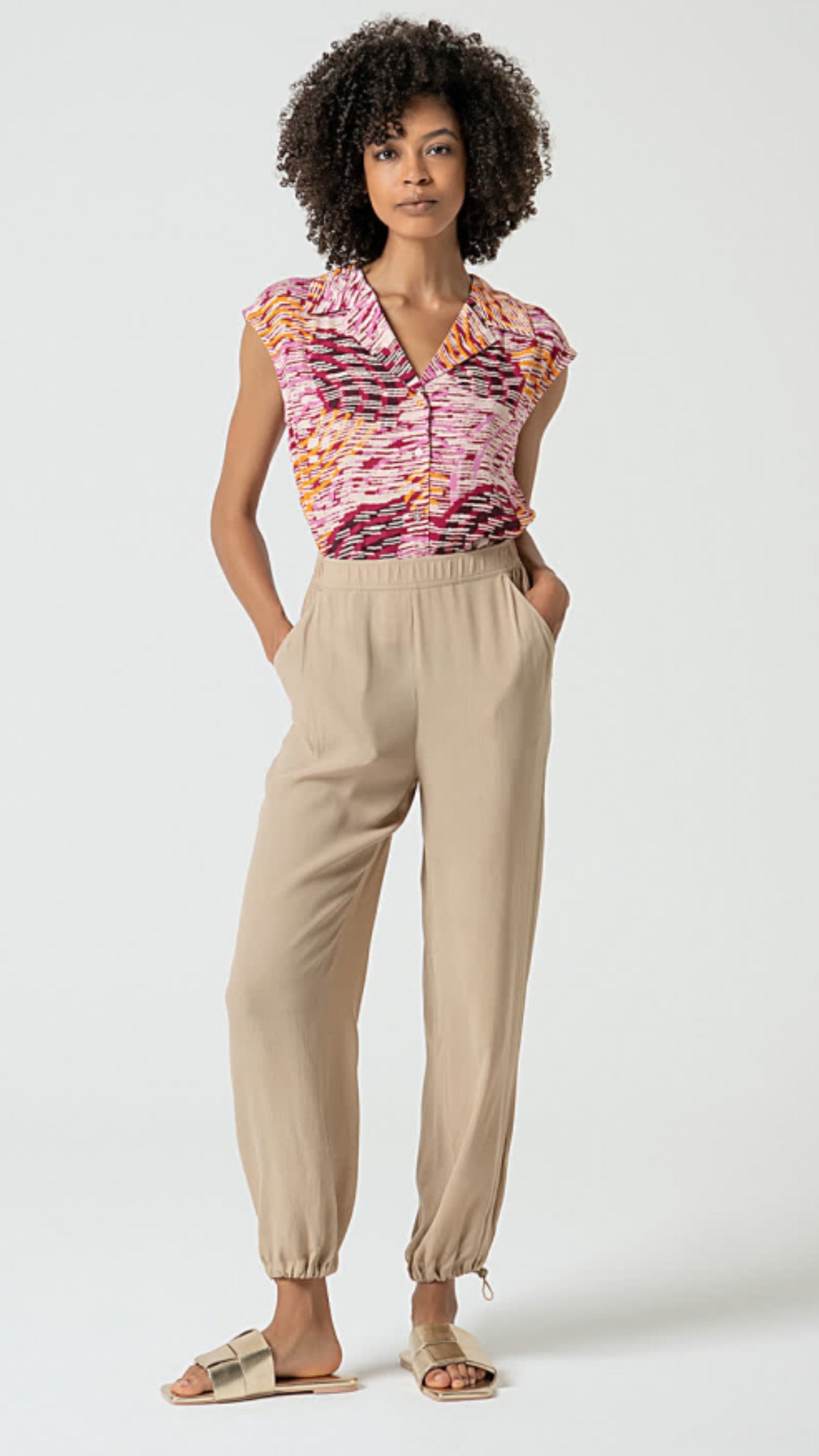 Este pantalón jogger es la opción ideal para quienes buscan comodidad y un toque de estilo relajado. Confeccionado en crepé viscosa liso, su tejido es ligero, suave y fluido, proporcionando una sensación de frescura y libertad de movimiento. Su corte jogger con cintura elástica y cordón ajustable lo convierte en una prenda cómoda y versátil para cualquier ocasión informal.
