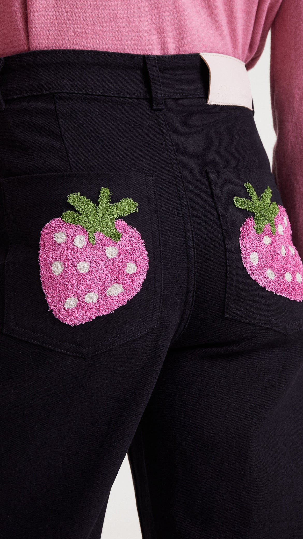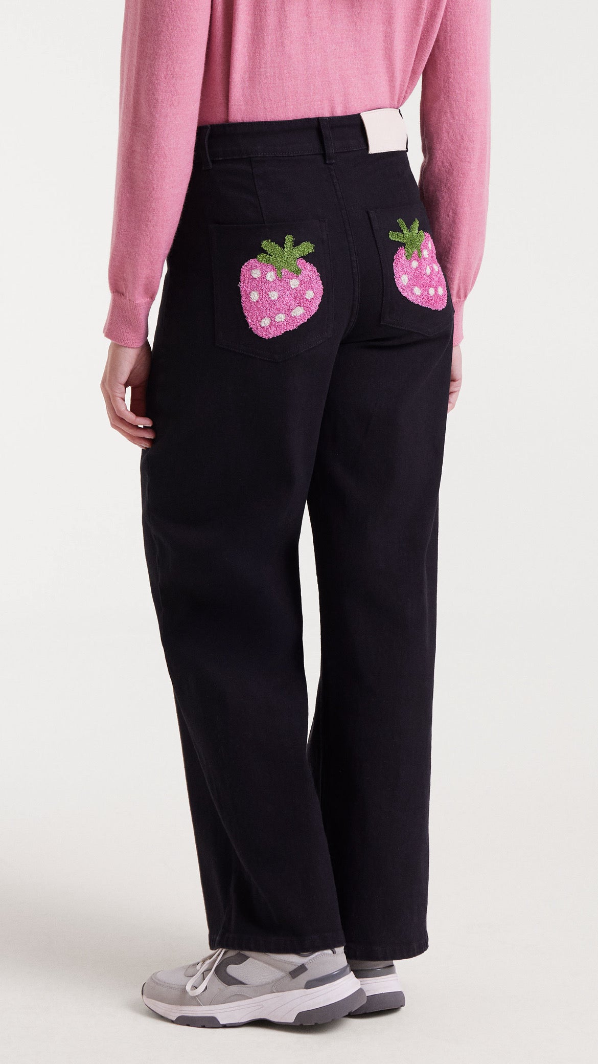 Vaquero recto de tiro alto en color negro, con detalle de fresas bordadas en los bolsillos traseros. Un básico versátil que combina comodidad y un toque divertido para destacar en cualquier look.