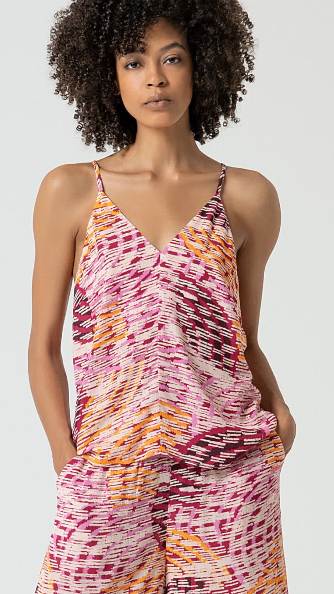 Un top perfecto para quienes buscan comodidad y un toque vibrante en su armario. Su corte oversize garantiza una caída fluida y ligera, mientras que su estampado multicolor aporta frescura y dinamismo a cualquier look. Los tirantes finos añaden un detalle delicado, ideal para los días más cálidos.
