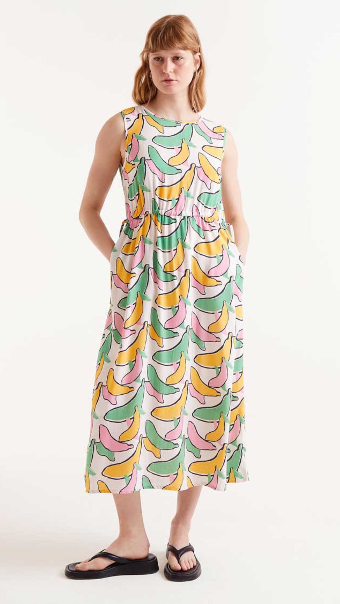 Este vestido midi combina un diseño favorecedor con un estampado original y vibrante. Con cuello redondo y sin mangas, es una pieza versátil y cómoda para los días de calor. Su ajuste en la cintura resalta la silueta, mientras que los bolsillos laterales aportan funcionalidad sin renunciar al estilo. El cierre trasero con abertura y botón añade un sutil detalle chic.