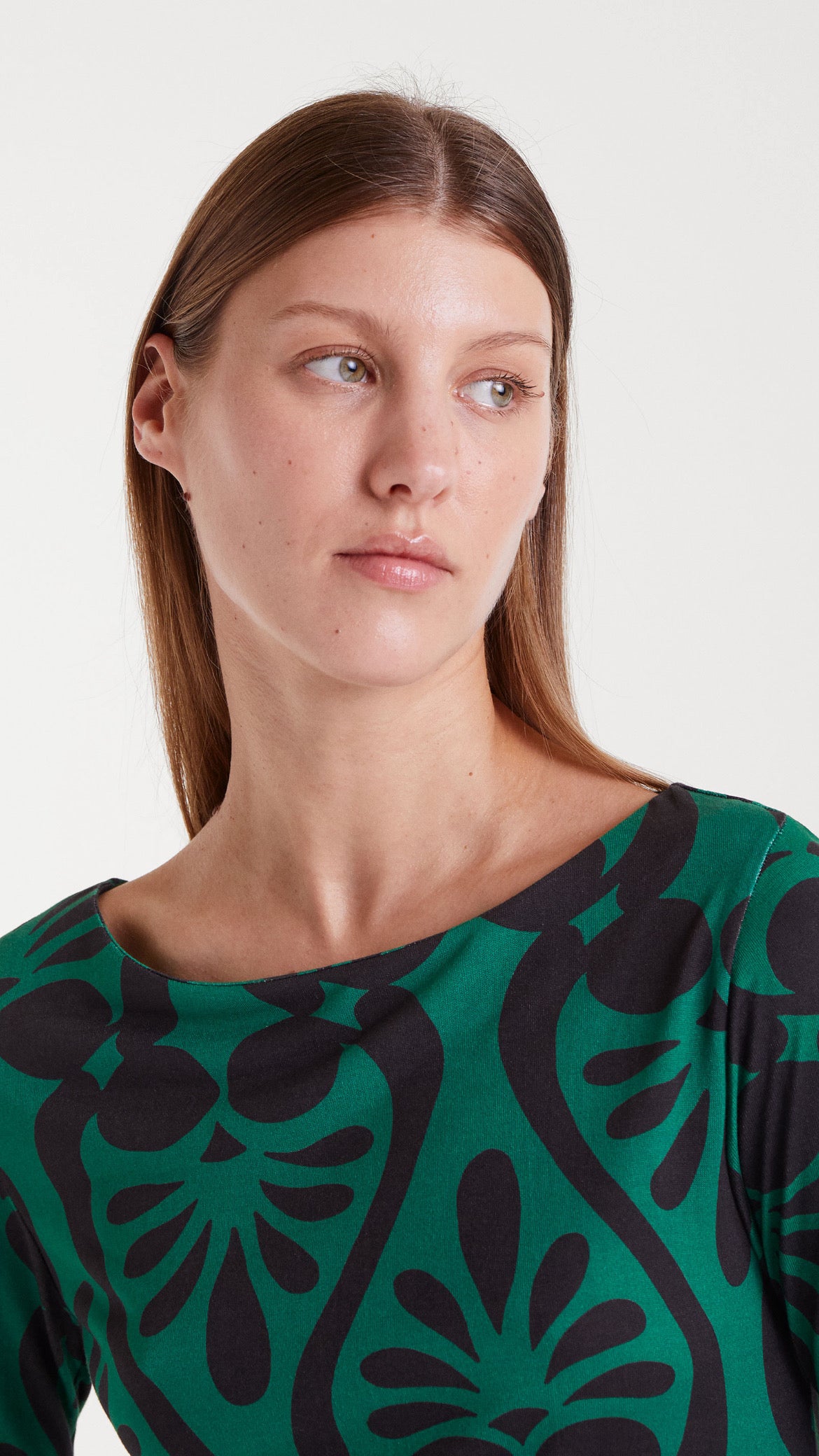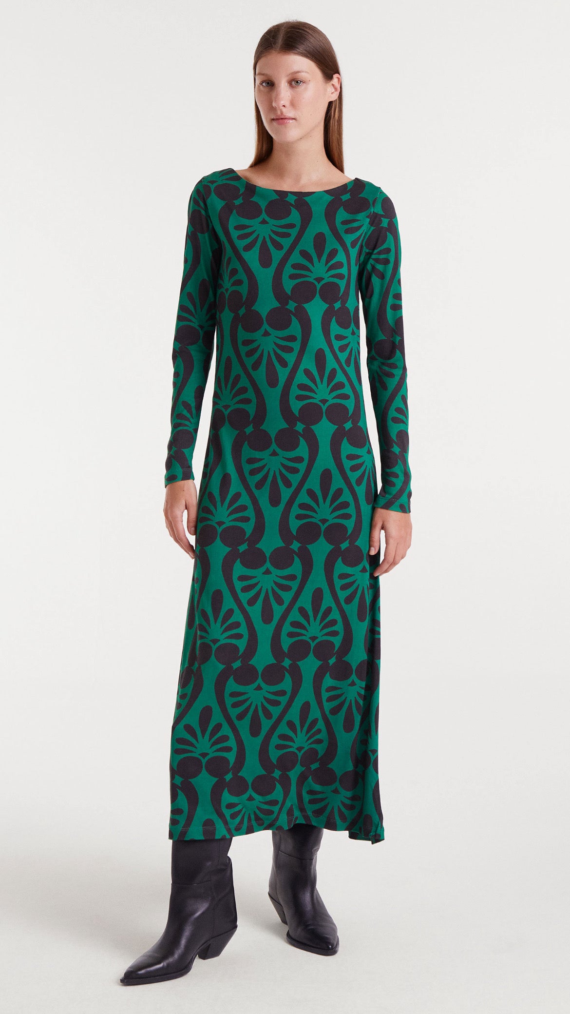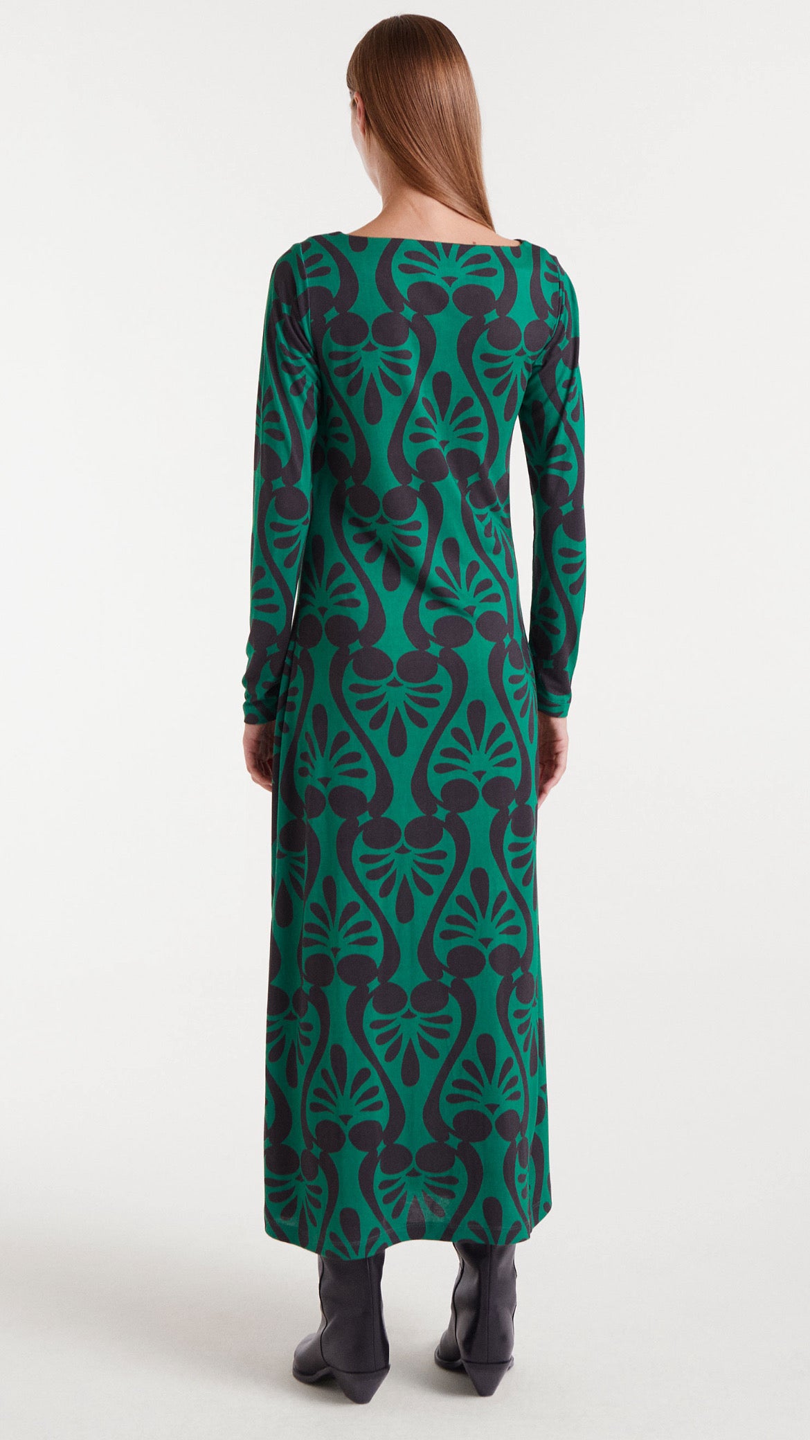Resalta tu estilo con este vestido largo verde de diseño elegante y cómodo, confeccionado en suave tejido jersey de viscosa. Su estampado Baroque de inspiración geométrica aporta un toque artístico y distintivo, perfecto para quienes buscan una prenda con personalidad.