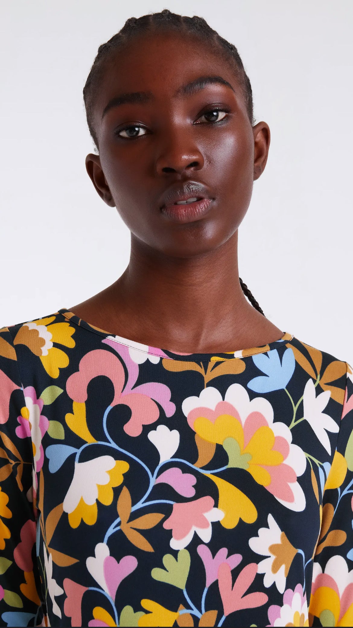 Vestido de manga larga con estampado floral Baboushka en colores vibrantes 🌸💛💙 sobre fondo oscuro. Corte midi con vuelo, cómodo y favorecedor, perfecto para alegrar tus días de otoño e invierno.